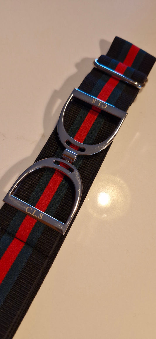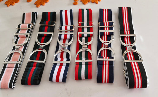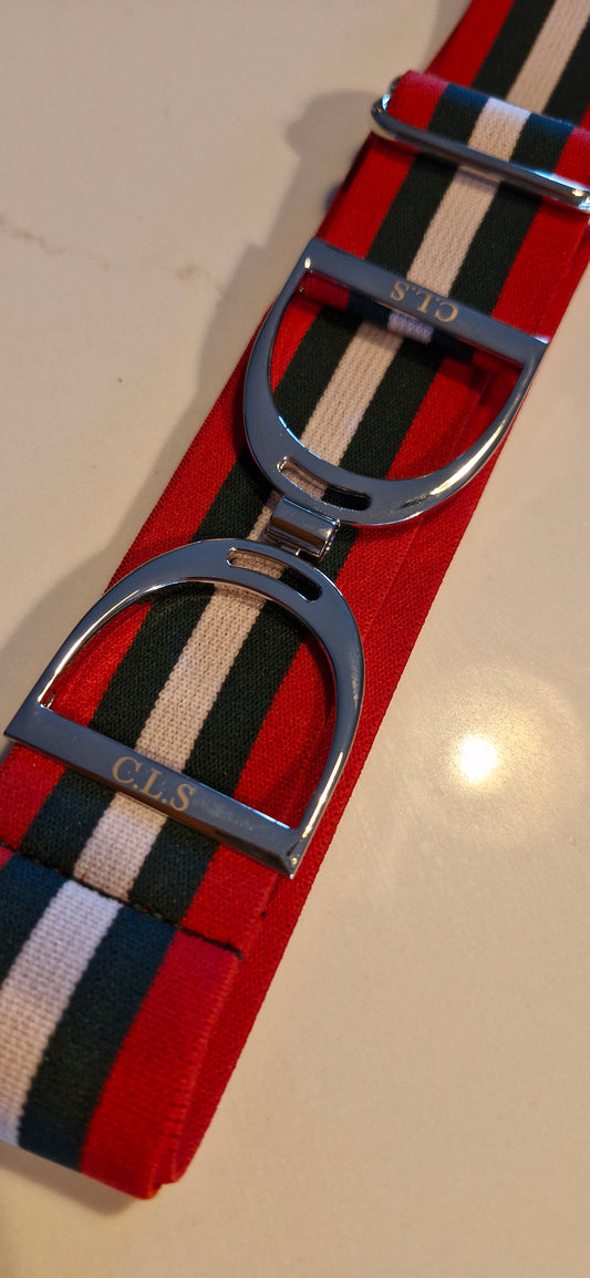CLS Silver Stirrup Elastic Belt 1.5" Red with Green & White Stripe