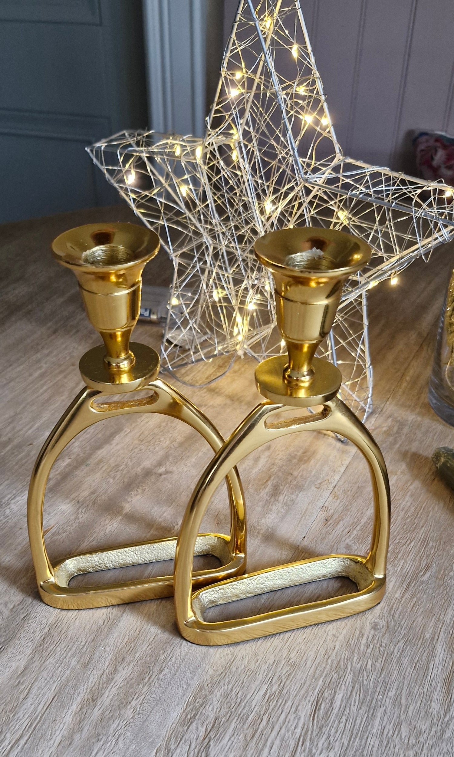 - Pair of gold Plated Stirrup Candlestick Holders