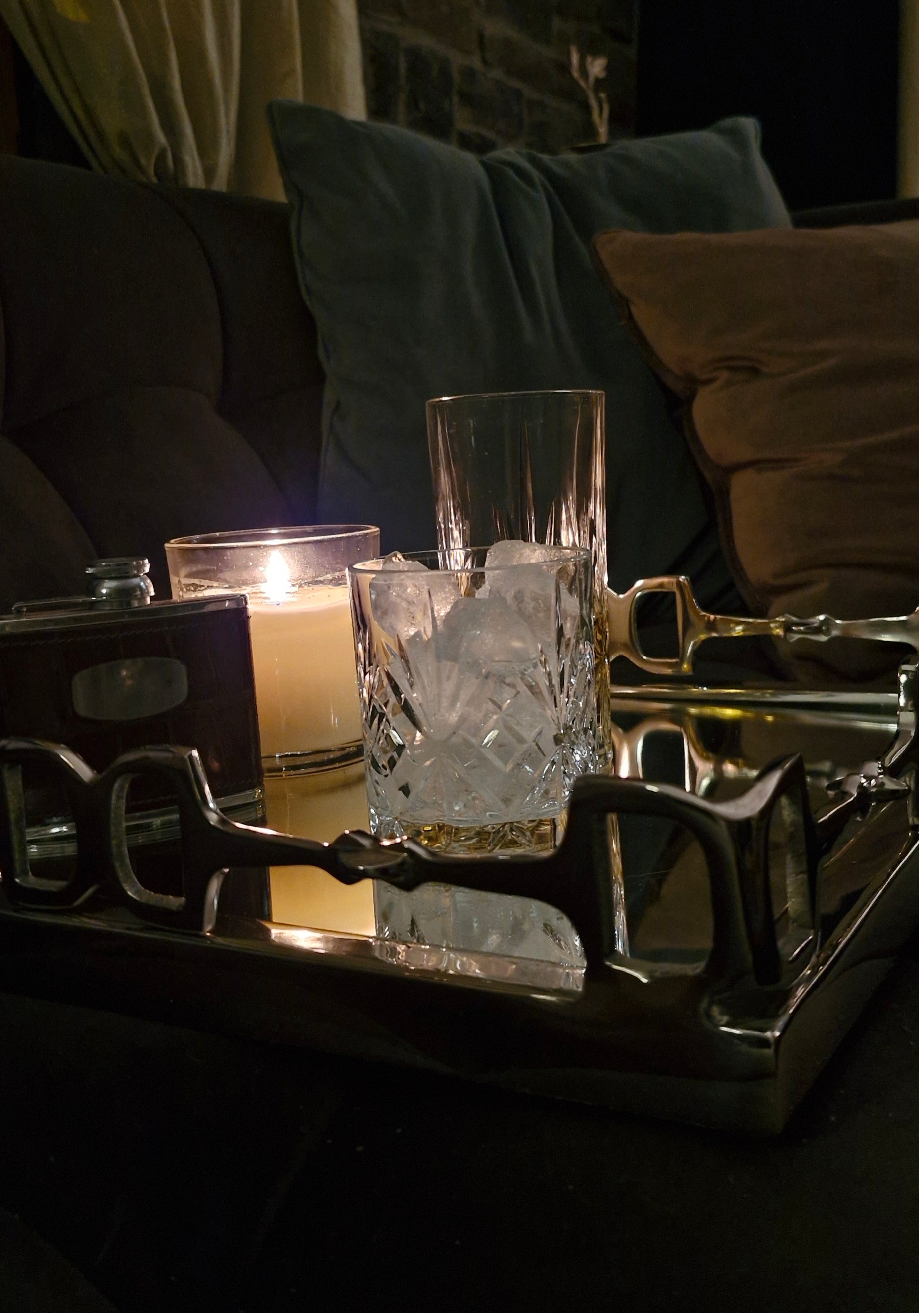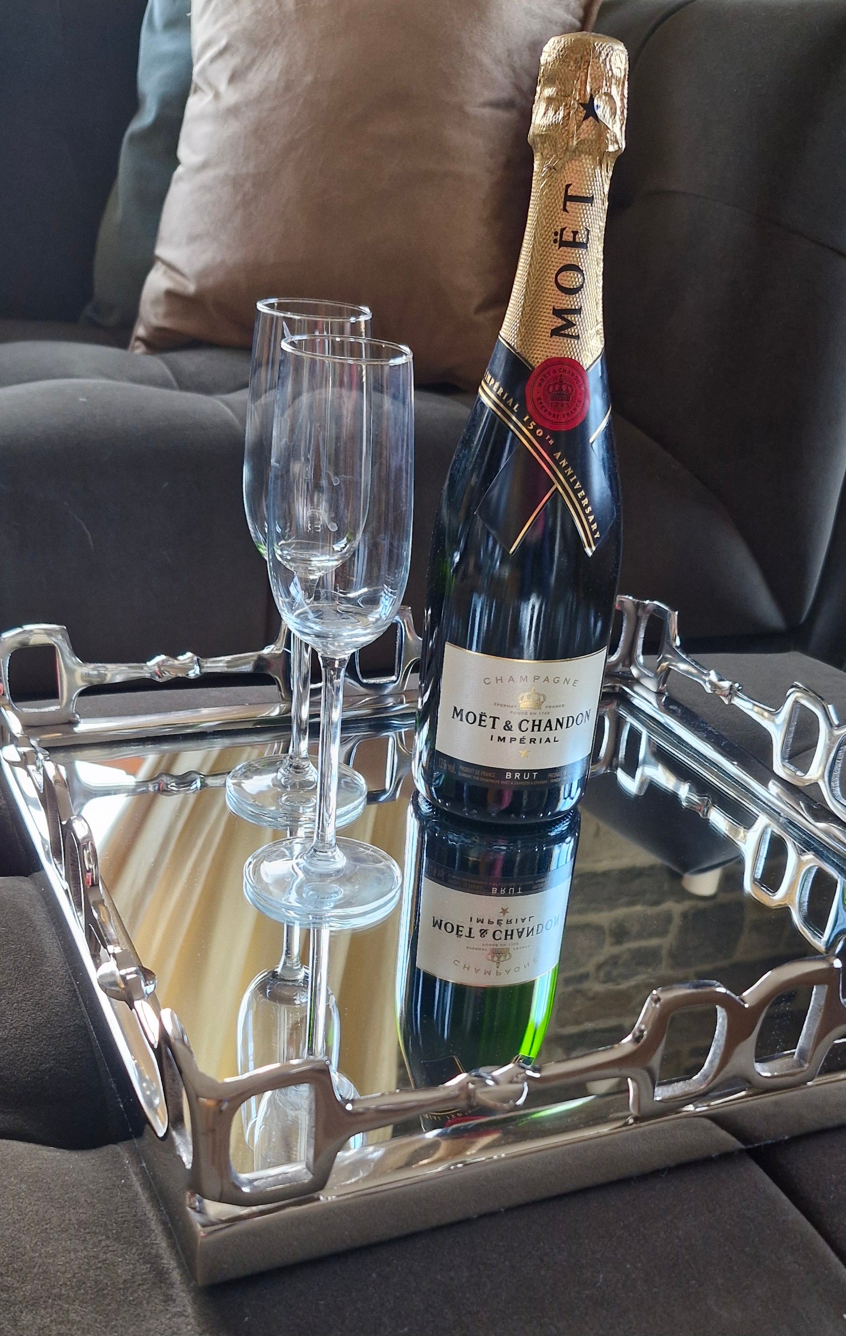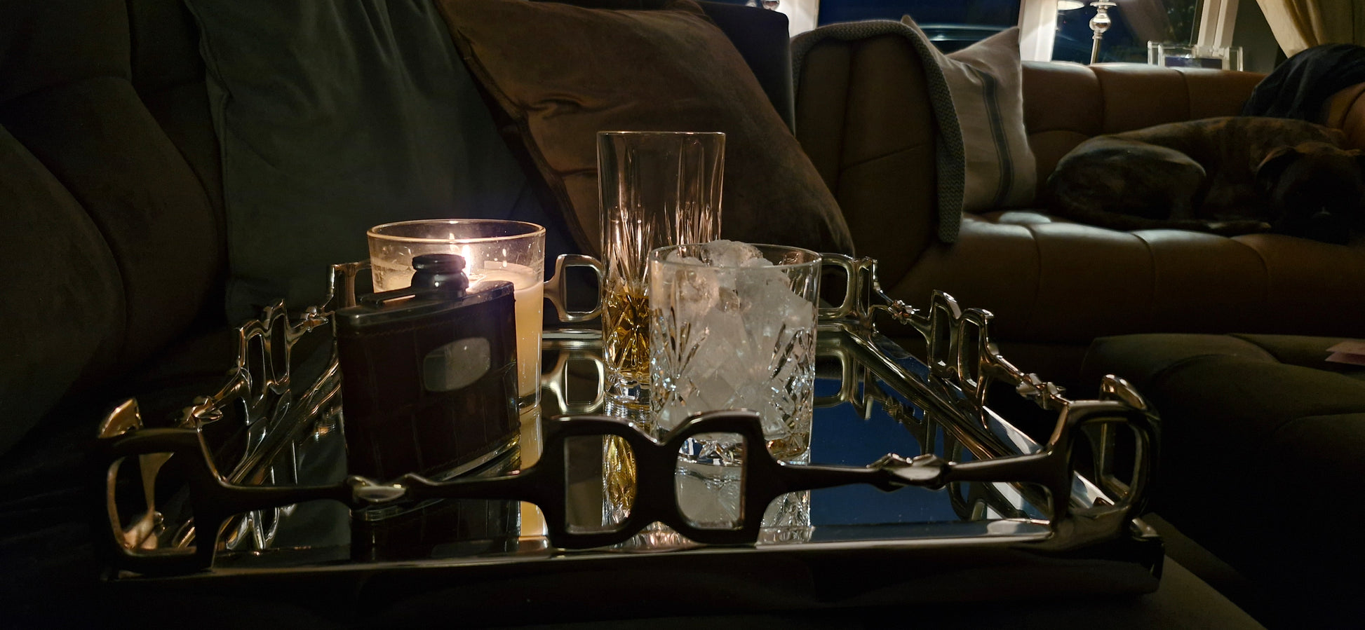 This is a beautiful handmade square tray, with equestrian inspired snaffle bit details as the border on raised metal edges with a mirrored base. Can be used as a serving tray or decorative display.
