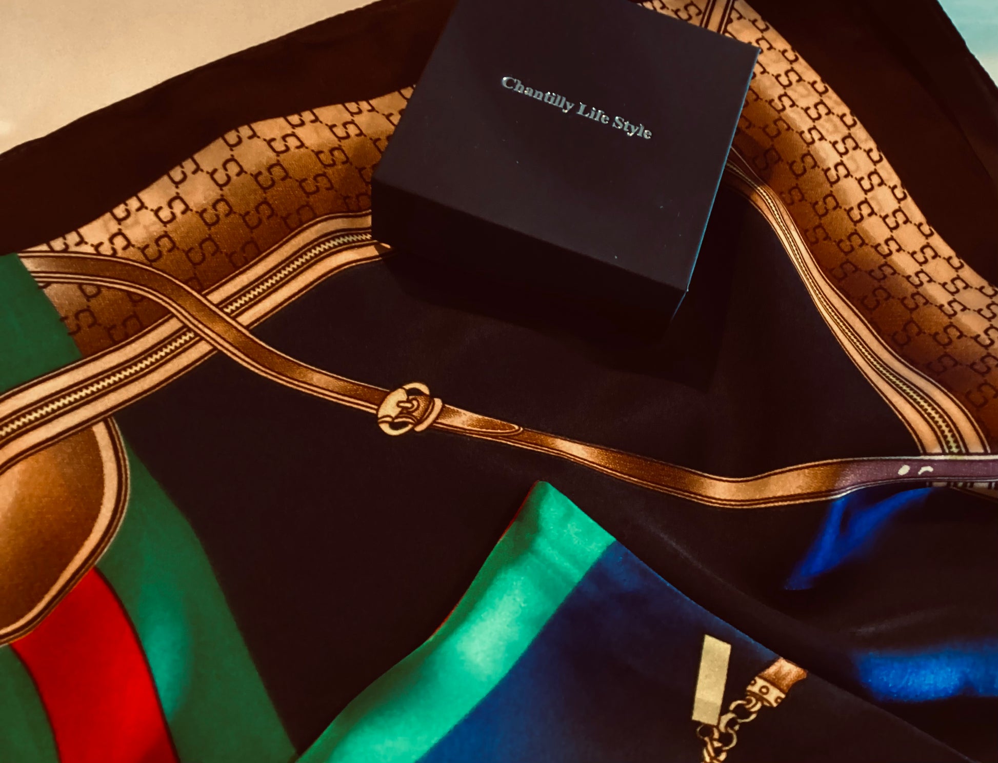 Dark blue, green & red detail featuring intricate geometric designs. The perfect choice when looking to accessorise a coat or blazer.